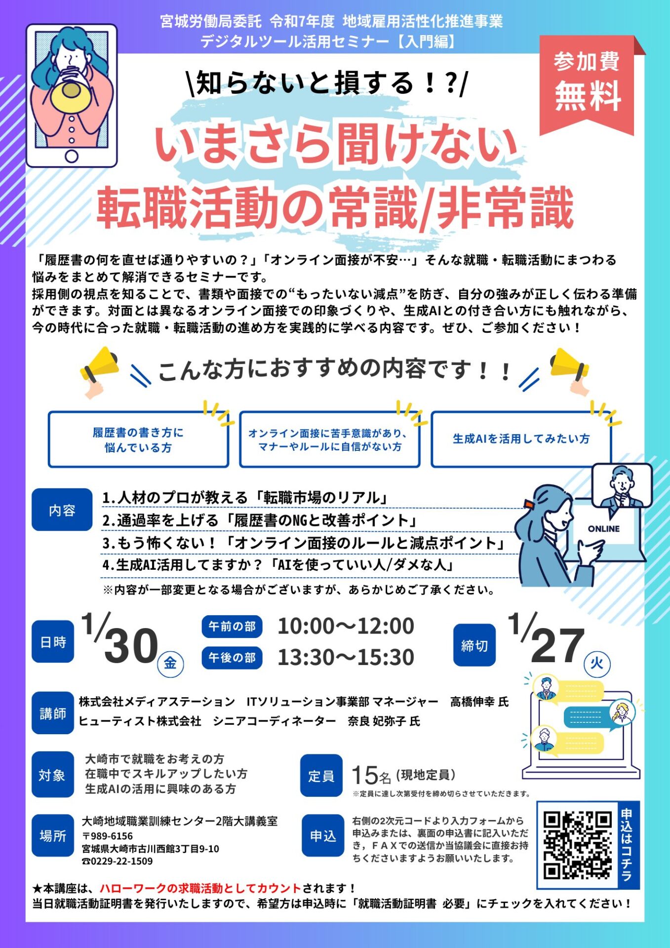 対象:大崎市で就職をお考えの方・在職中でスキルアップしたい方・生成AIの活用に興味のある方